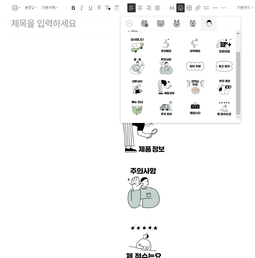 네이버 블로그에서 다양한 이모티콘이 많아서 부러운 부분이 있었는데, 좀 더 많은 이모티콘이 추가가 되었으면 좋겠다.
